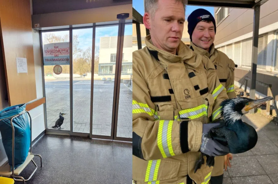 The injured cormorant, which had a triple fishing hook stuck in its beak, sought help by pecking at the door of an emergency room in Germany until medical staff noticed it and called firefighters.