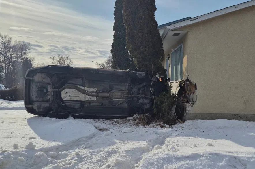 According to Saskatoon police, on Friday morning a man driving a Ford Fusion suffered a medical event and his car hit a house before flipping onto its side. No charges were laid.
