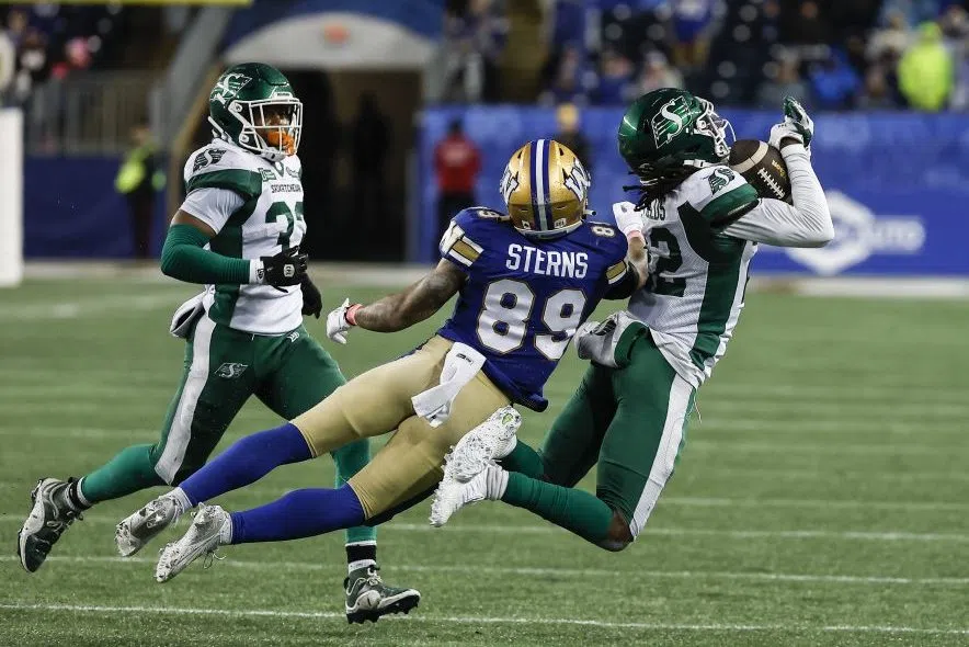 Saskatchewan Roughriders’ DaMarcus Fields (22) intercepts the pass intended for Winnipeg Blue Bombers’ Jerreth Sterns (89) during second half CFL action in Winnipeg Friday, October 17, 2025. (THE CANADIAN PRESS/John Woods)