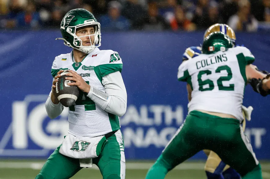 Saskatchewan Roughriders quarterback Jack Coan (14) throws during second half CFL action against the Winnipeg Blue Bombers in Winnipeg Friday, October 17, 2025. (THE CANADIAN PRESS/John Woods)