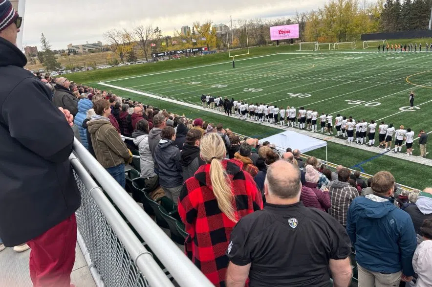 Fans pack Leibel Field in Regina as the Thunder and Huskies line up before kickoff in Sunday’s Prairie Football Conference semifinal on Oct. 19, 2025. (Jacob Bamhour/980 CJME)