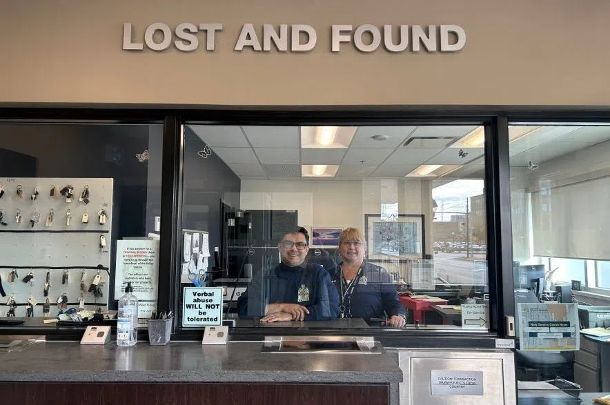 Carolyn Hyshka and Noe Hernandez have made it their mission to return lost items to their rightful homes through their roles with the Saskatoon Police Service Lost and Found. (Brittany Caffet/650 CKOM)