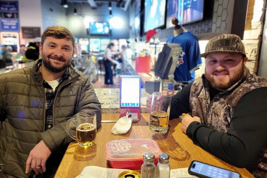 Blake Connolly (right) was visiting Regina from Georgia, U.S.A. The two were in Saskatchewan on a duck-hunting trip, and stopped in to watch the end of the series. (Daniel Reech/980 CJME)