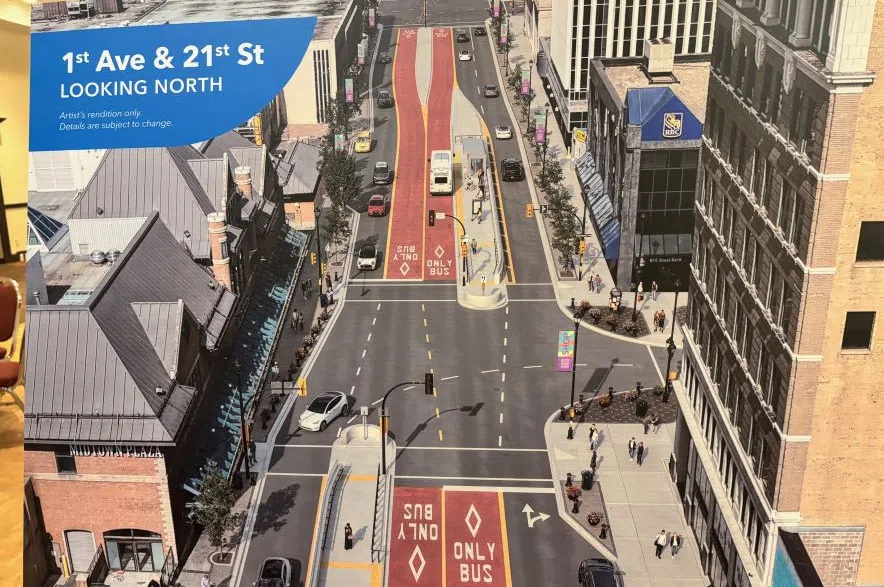 According to Rob Dudiak, the city’s technical services department special projects manager, part of the city’s Link Bus Rapid Transit (BRT) project — First Avenue, from 20th Street to 25th Street — will be transformed to included dedicated transit lanes in the centre of the road, pedestrian platforms and just one lane of vehicle traffic in each direction.