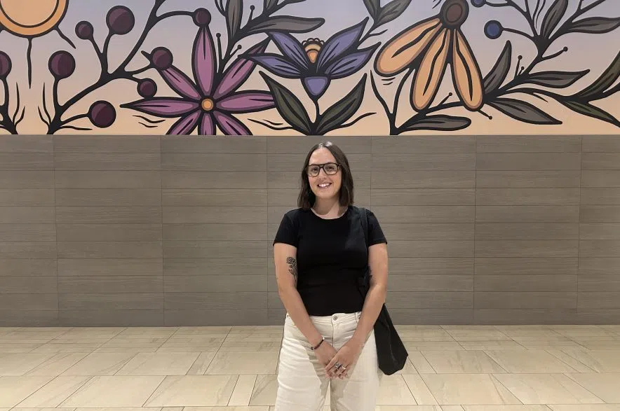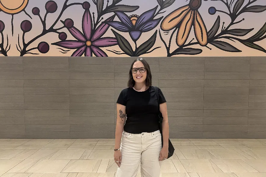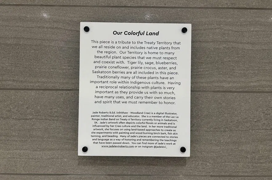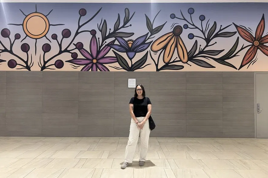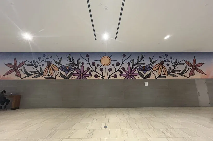 This vibrant mural in Saskatoon’s Midtown mall features native prairie plants, bold Woodland-style linework and a sun that symbolizes a treaty promise. (Brittany Caffet/650 CKOM)