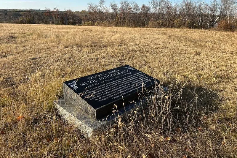 A new stone marking an old story. Neville Pendygrasse drowned in the South Saskatchewan River in 1887. His mother later settled nearby, never far from her son’s resting place. (Brittany Caffet/650 CKOM)