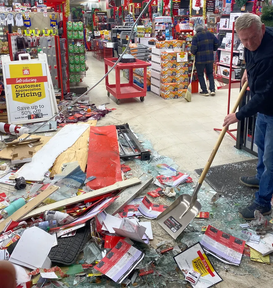 Staff members use tools from the store to clean up the damage following the crash on Friday morning. (Majken Cooke/Submitted)