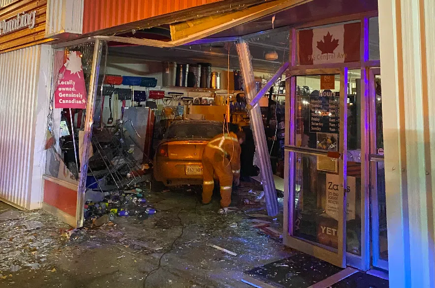 No injuries were reported after a car crashed into a Saskatoon hardware store early on Friday morning, but the occupants of the vehicle were not found by firefighters responding to the scene.
