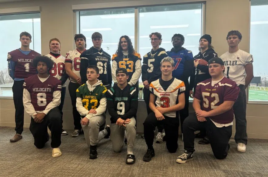 High school football players including Ewan Pickering (back row forth from the left) and Christian Kobelsky (back row fourth from the right) from across Regina gather at Leibel Field on Tuesday as Regina Public Schools, Regina Catholic Schools and Regina Minor Football announce the launch of the Regina Football Academy.(Jacob Bamhour/980 CJME)
