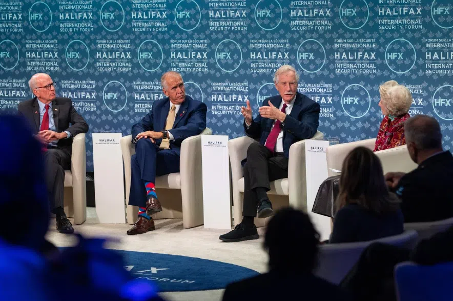 From left: Senator Peter Welch, of Vermont, Senator Thom Tillis, of North Carolina, Senator Angus King, of Maine and moderator Congresswoman Jane Harman take part in the Halifax International Security Forum, Saturday, November 22, 2025. (THE CANADIAN PRESS/Kelly Clark)