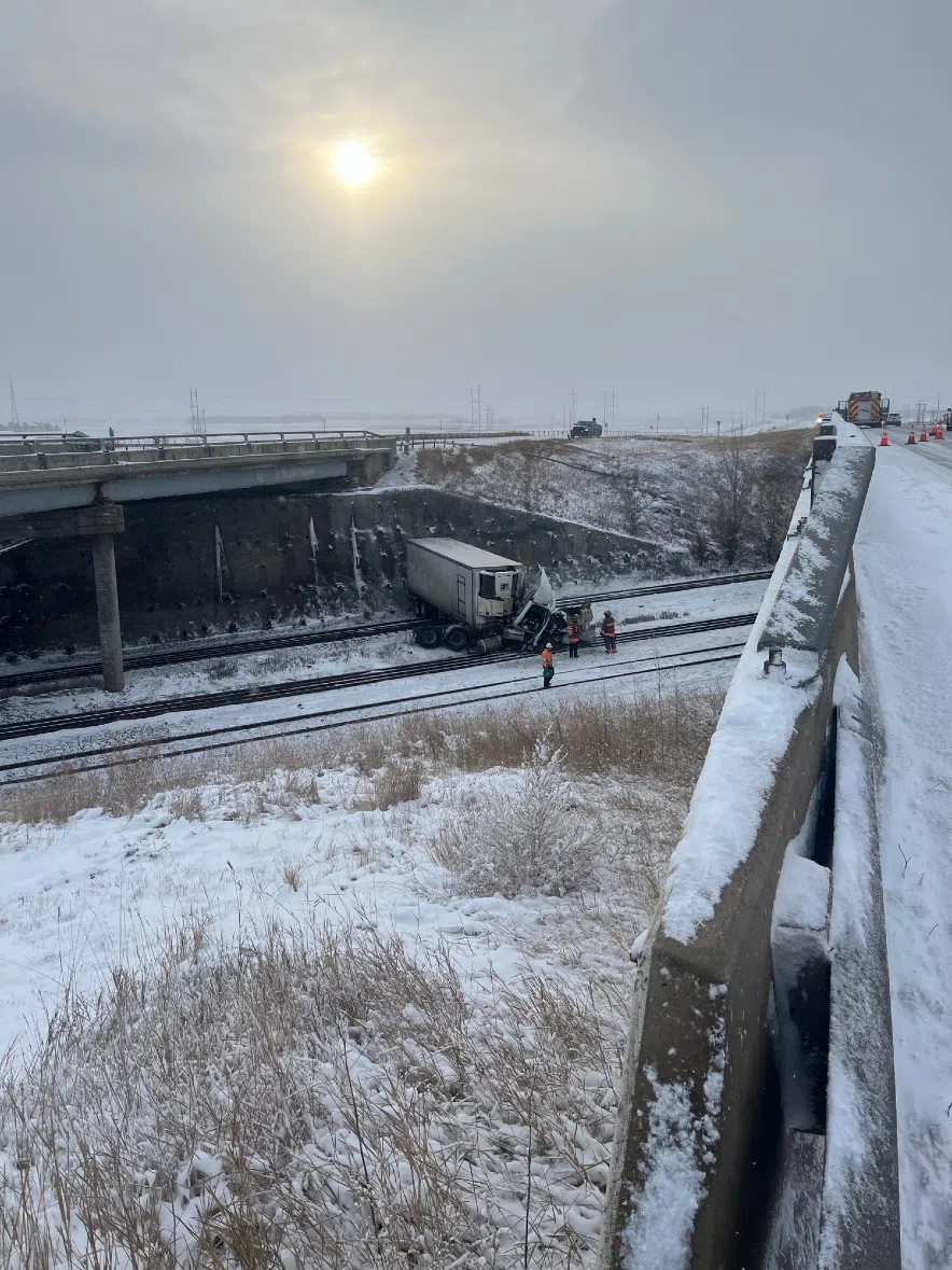 A semi slid off the Highway 7 rail overpass at 11th Street West on Nov. 28, 2025. The driver was not injured. (Saskatoon Fire Department/Submitted)