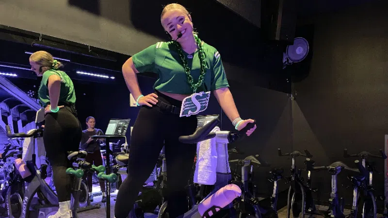 Spinning work and pleasure together, RYDE YXE instructor Paige Hansen hosted a Roughriders-themed class. She's bled green ever since the team brought her happiness after childhood cancer treatments.