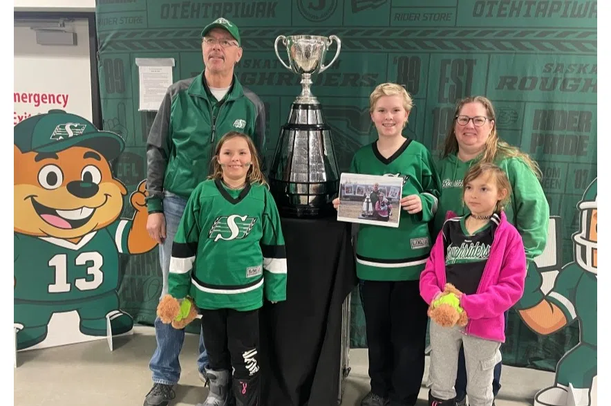 Wilson family members Bruce (left), Alexis (second from left), Carter (middle), Lynn (second from right) and Kendra (right) posing with the Grey Cup at the 2026 Riders Winter Classic. (Scott Roblin/650 CKOM)