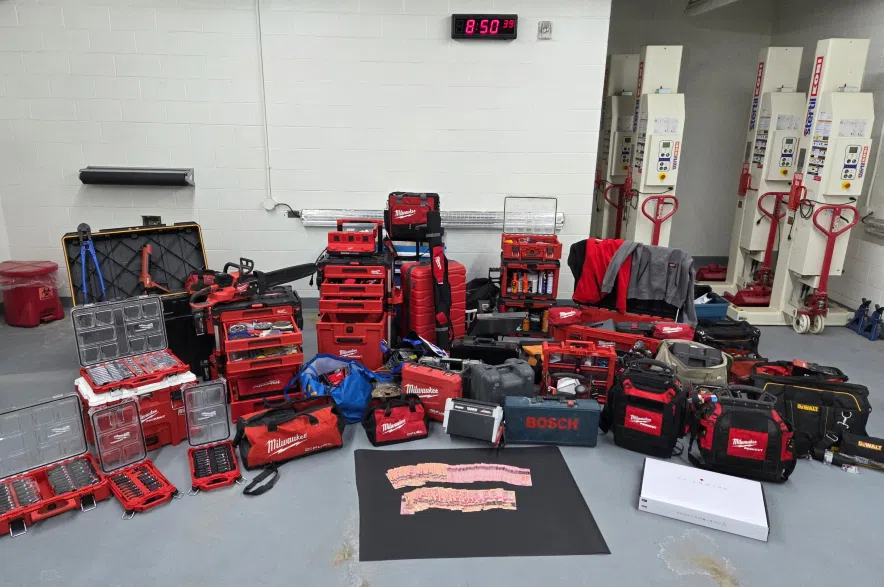 Several thousand dollars worth of tools believed to be purchased with counterfeit currency as well as materials and equipment used to produce counterfeit currency was found during a search at a home in Rosthern, police said. (Saskatoon Police Service/Submitted)